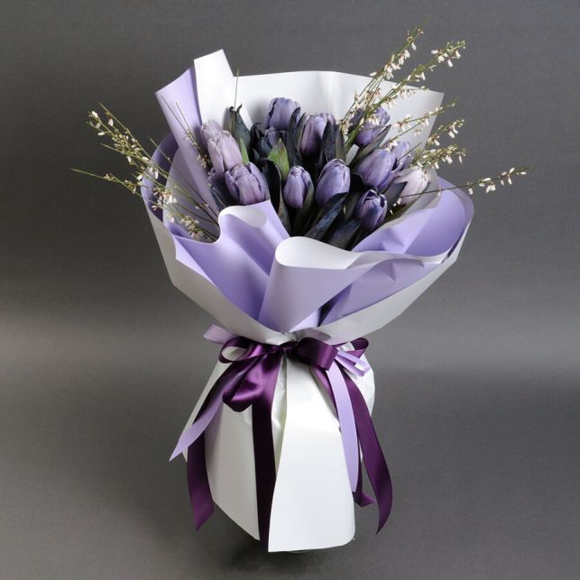 One of the main advantages of shopping at Camellia is the impeccable quality of the flowers in each bouquet. The blue tulips, capturing the beauty of heavenly depths, impress with their freshness and richness of color. This bouquet is an embodiment of purity and sophistication.