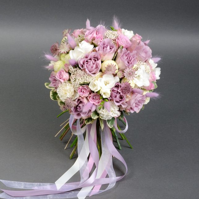 This bouquet comprises sophisticated imported flowers that harmoniously complement each other. The centerpiece is the imported "Memory Lane" rose, symbolizing tenderness and everlasting love. With lagerstroemia, astrantia, carnation, freesia, "Snow World" and "Happy Yo-Yo" spray roses, ozothamnus, and phytosporum, the bouquet exudes uniqueness and festivity.