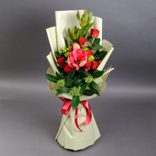 Camellia store presents the "Lancelot" men's bouquet for your consideration. This refined bouquet impresses with its sophistication and style. The use of red amaryllis adds a touch of elegance and luxury to the bouquet. When purchasing Lancelot from our store, you can be confident in the high quality of each flower and the professional approach to its creation.