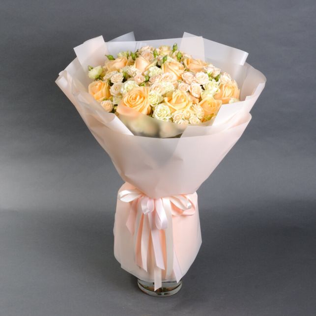 The advantages of shopping at "Camellia" are evident. First and foremost is the quality. Our flowers are lovingly grown by our own hands, with great care. Each rose is a masterpiece of nature that we preserve for you. Second is the unique design. The Spray Roses and Avalanche Peach bouquet looks incredibly beautiful and stylish, accentuating your individuality.