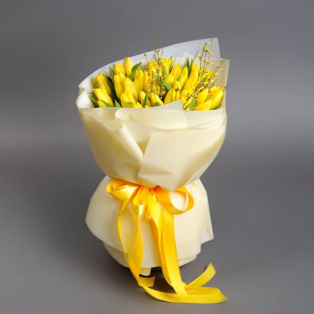 The bouquet of yellow tulips "Vitamin D" from the Camellia store is an exquisite composition designed to bring light and warmth to your home at any time of the year. Each tulip in this bouquet is a work of art created by nature. The yellow hues create an atmosphere of joy and positive emotions.