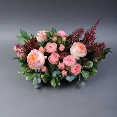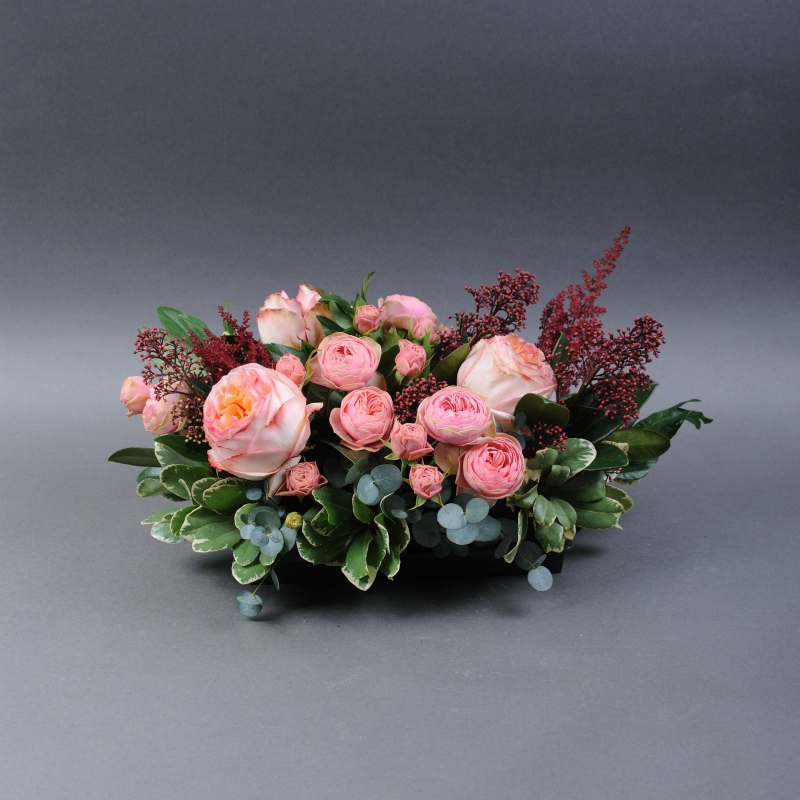 Expression peony rose, Skimmia, Helleborus, World Trendsetter rose, Astilbe, oasis plate