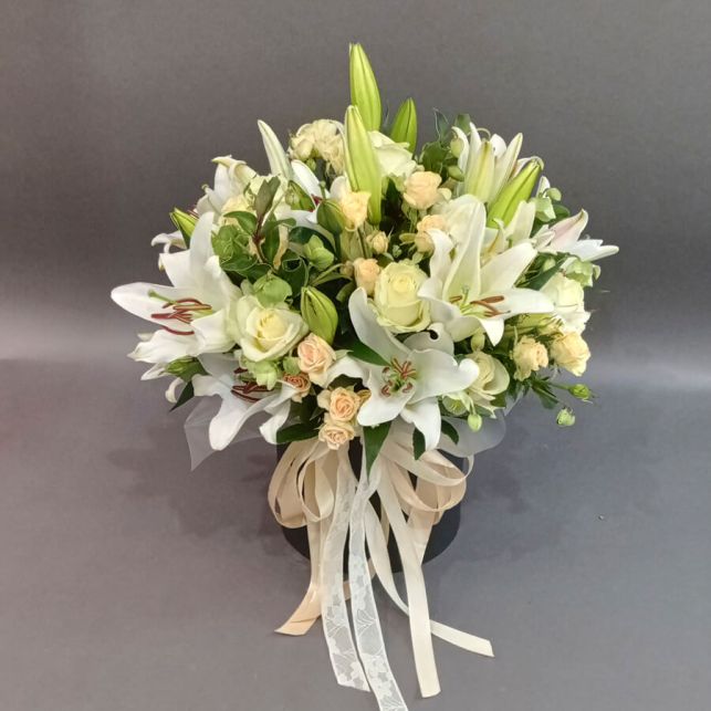 The composition with lilies and roses from Camellia store is a magnificent combination of exquisite flowers that captivates with its elegance and unparalleled beauty. Every detail of this composition is carefully selected to create a harmonious image. Lilies blooming in all their glory add fragrance and refinement to the bouquet. Roses Avalanche and Elena add a romantic mood and tenderness, while chrysanthemums are distinguished by their sophistication and longevity. To this wonderful mix of natural beauties, green ruscus is added, creating a unique accent and complementing the composition with its freshness and lightness. Purchasing this composition from Camellia store, you not only get high-quality flowers but also an unforgettable experience that will be remembered for a long time. Treat yourself or your loved ones to this unparalleled bouquet, and it will become a true symbol of your tenderness and attention.