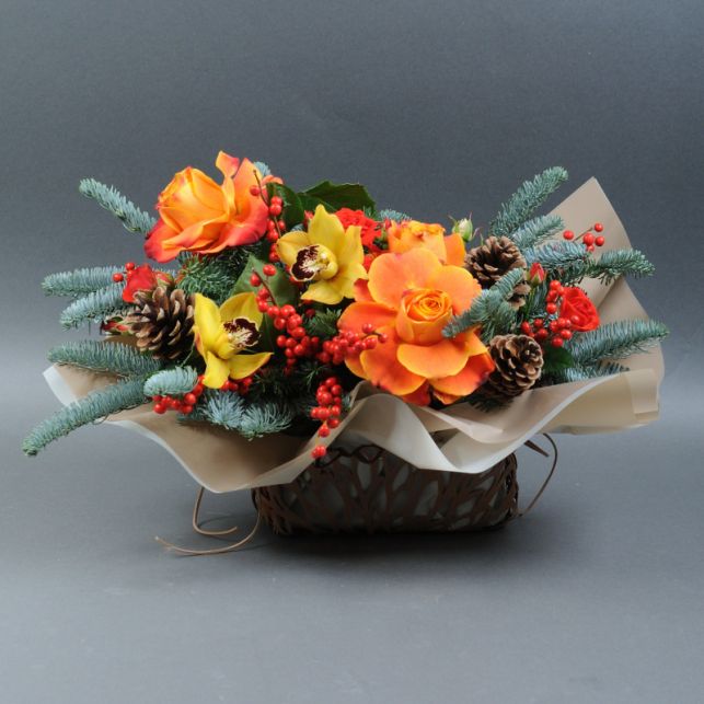 At "Camellia" store, we are excited to present to you the unique New Year's composition "Ice and Flame." This enchanting arrangement combines elements of winter and fiery energy, creating an atmosphere of wonder and warmth. It consists of delicate ilex and noble fir adorned with pine cones, striking cymbidium orchids, and blooms of Kahala roses and Vanessa spray roses.