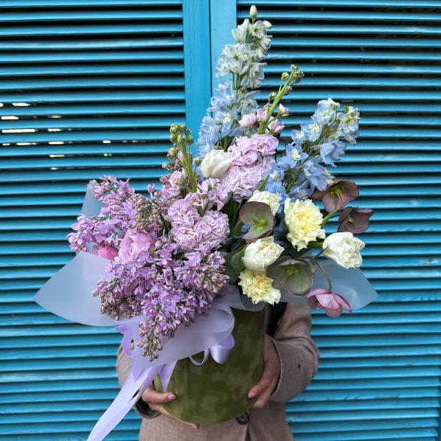 Peony-shaped rose Lavender Bubbles, mattiola, delphinium, lilac, helleborus, carnation, tulip