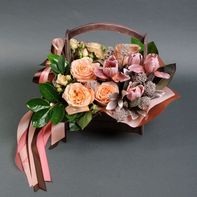 Camellia store invites you to purchase the amazing "Jam" composition. This bouquet consists of the highest quality spray roses Elena, imported roses, tulips, and skimmia. It impresses with its sophistication and originality. Buying from our store ensures freshness and longevity of flowers, as well as excellent service for our customers. Enjoy the unmatched beauty of this composition, make your day even brighter with Camellia!
