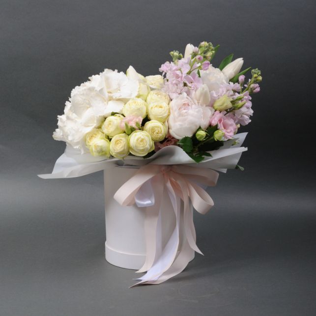 Hydrangea, Matiola, Peony, rose Snow World spray, tulip, Eucalyptus Cinerea, Eustoma, hat box