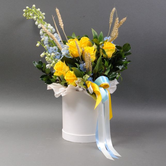 The "Greetings from Ukraine" composition from Camellia is a wonderful way to express your feelings and wish good to your loved ones. In our stylish "Ukraine" box, you will find spray roses Luna Trendsetter and Penny Lane, triticum, delphinium, and helleborus. This composition will not only add special charm to your greetings but will also delight with its freshness and beauty for a long time. Purchasing the "Greetings from Ukraine" composition at Camellia, you will receive high-quality flowers and guaranteed satisfaction from your purchase.