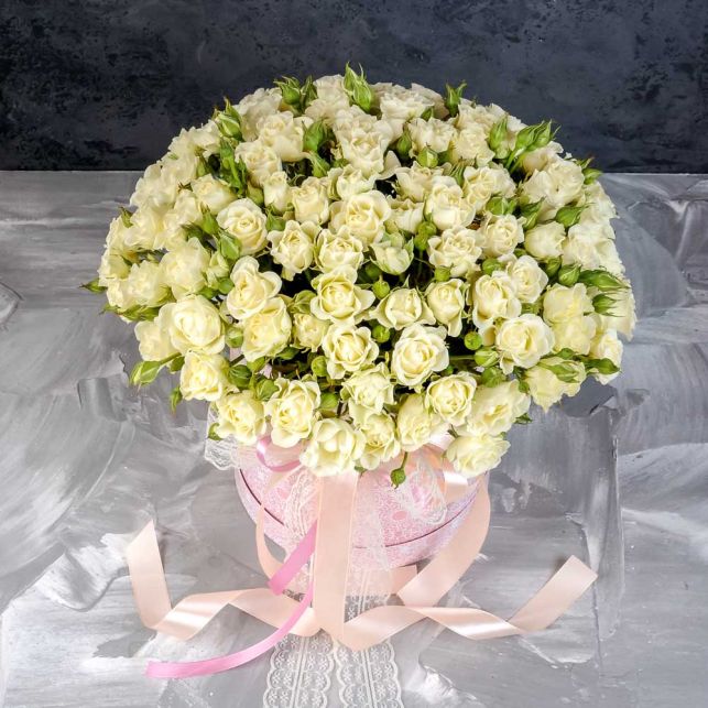 Composition with Snow Flake spray roses in a box from Camellia store are not just a wonderful gift, but also a symbol of your sincere feelings. Each rose bud is grown with love and care to bring unforgettable moments of joy and admiration. Choosing our Snow Flake spray roses in a signature box guarantees you sophistication and style, as each box is adorned with delicate satin ribbons. Allow yourself to immerse in the atmosphere of tenderness and beauty with a bouquet from Camellia.