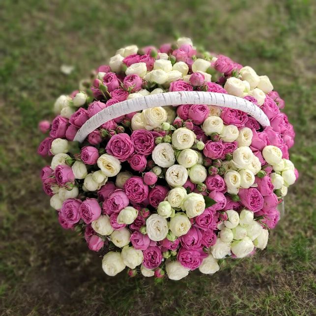 "Camellia" store presents an enchanting basket of roses "Snow World and Misty Bubbles". This unique composition includes spray peony-like roses "Misty Bubbles" and "Snow World", cultivated by our specialists. These flowers are a true wonder of nature, and we, "Camellia", guarantee their quality and freshness.