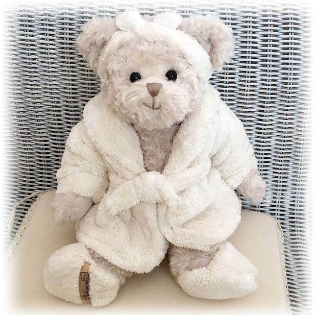 The big bear-girl of light-gray color in a snow-white bathrobe, 40 cm