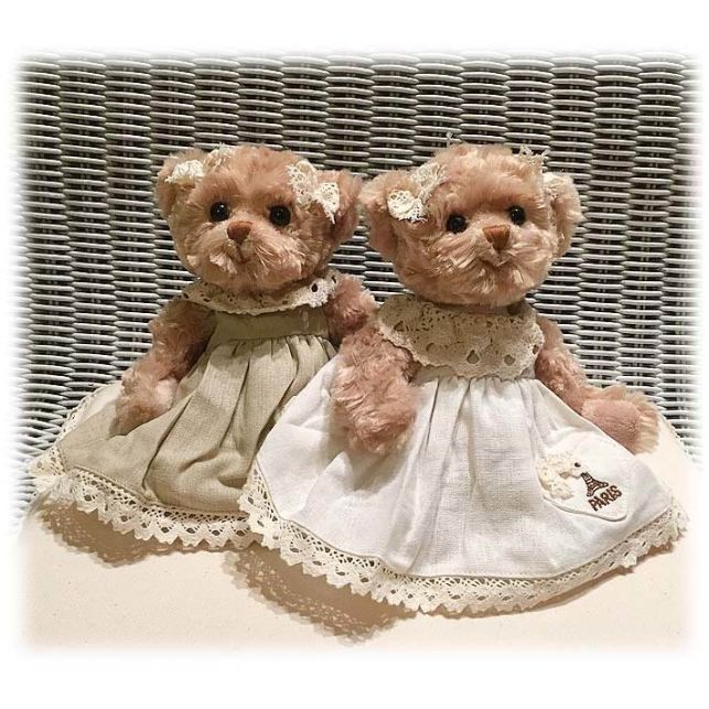 Teddy bear is a medium-sized girl in a dress of two colors with embroidery "I love Paris", 25 cm