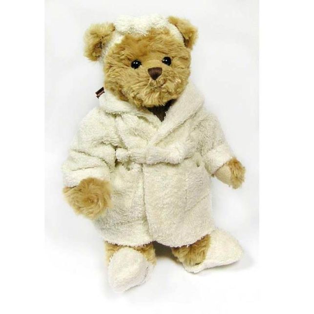 Brown bear-girl in white terry dressing-gown, 30 cm
