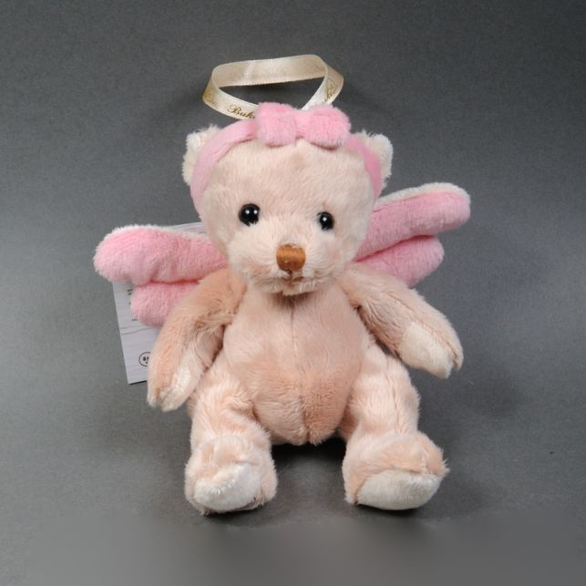 Soft toy bear Guardian Angels-Baby 15 cm. Cute bear with pink wings. The girl has a pink headband with a bow in the color of her neck wings. Material: plush made of high-quality polyester fiber, eyes – acrylic, nose – polyethylene resin.