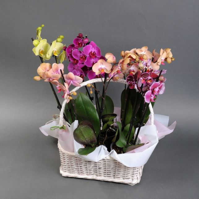 Welcome to "Camellia" store! In our assortment, you will find the best orchids that attract with their beauty and unique elegance. One of our most popular items is the orchid mix in a basket.