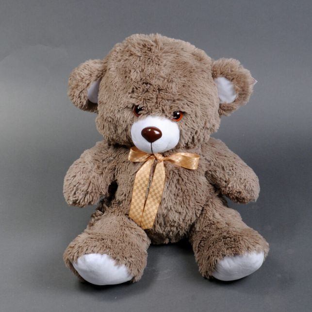 A soft toy in the shape of a bear. Color: cappuccino. Made of faux fur.