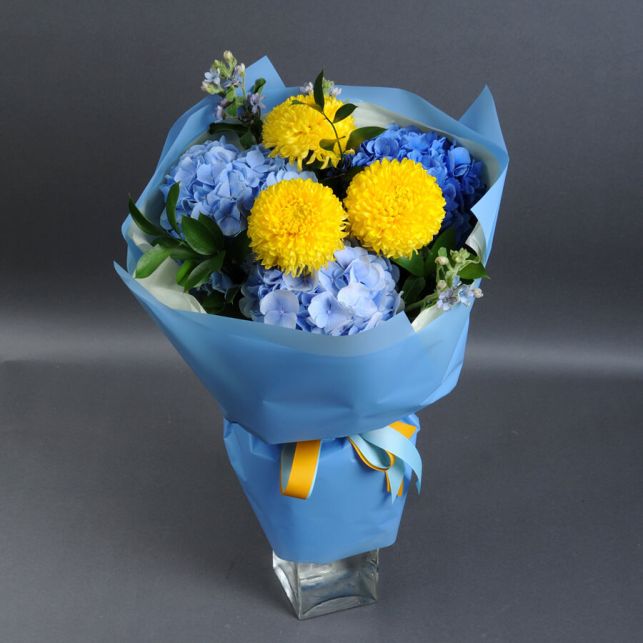 This Yellow-Blue bouquet impresses with its beauty and harmony of colors. It consists of exotic hydrangeas, green ruscus, vibrant chrysanthemums, and delicate oxypetalums. Each floral bud is a small wonder of nature that we preserve for you. Choose this bouquet for a special occasion or simply to brighten the day of your loved one.