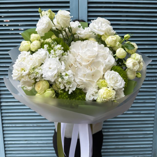 Гортензия, диантус Барбадос, роза Сноу Уорлд, эустома, матиола