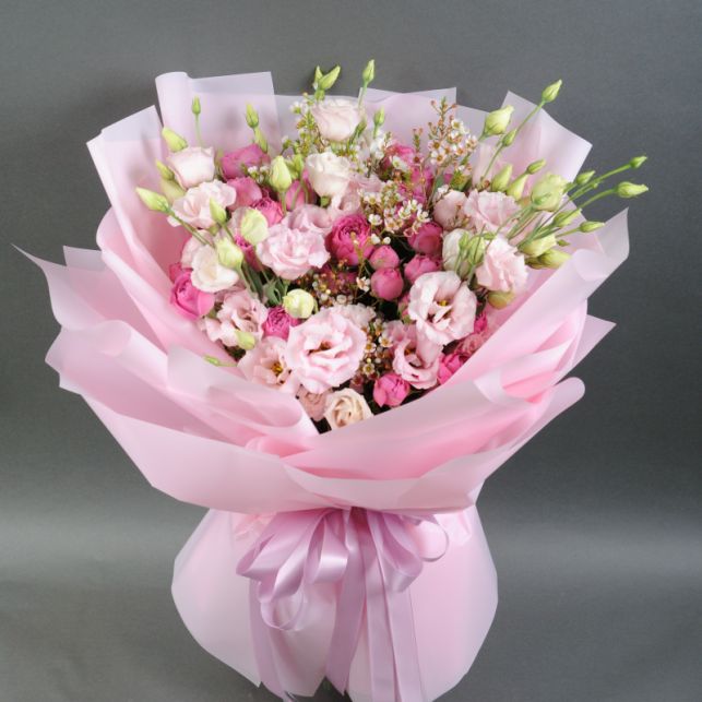 Магазин цветов Camellia приглашает вас ознакомиться с нашим новым творением - букетом "Монпанс'є". Этот изысканный букет, состоящий из роз, эустомы и хамелациума, создан, чтобы сделать ваши моменты особенными.