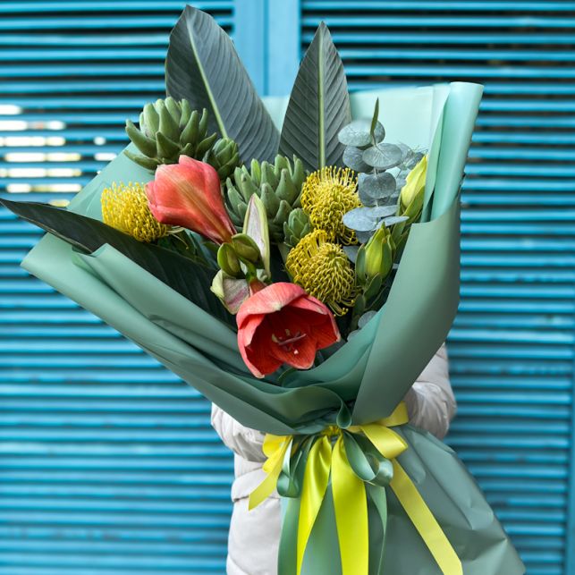 Артишок, амариллис, леукоспермум, леукадендрон, эвкалипт, лист стрелиции