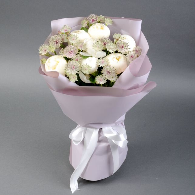 "Пионовое безе" - это не просто букет, а настоящее творение мастеров флористики. Каждый пион в букете раскрывается как живая картина, словно приглашая вас в мир самых красивых цветов. Аромат этих пионов завораживает и остается в памяти.