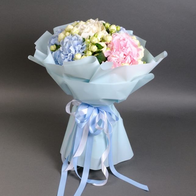 "Лазурь" - это не просто цветы, это настоящее искусство природы. Оттенки синего, белого и зеленого переплетаются, создавая гармоничную композицию. Каждый бутон будто уютно устраивается в объятиях другого, образуя баланс красоты и утонченности.