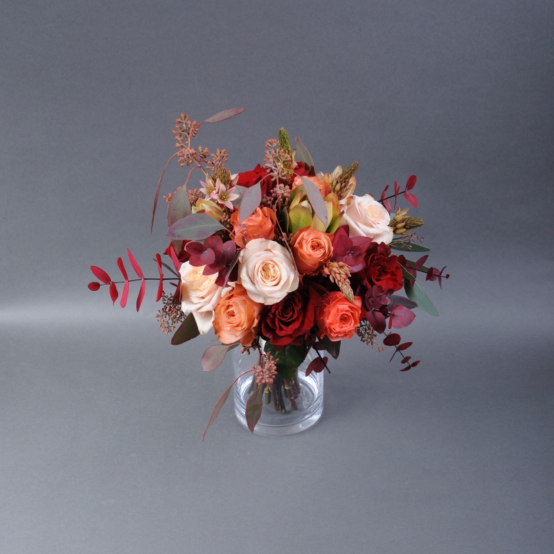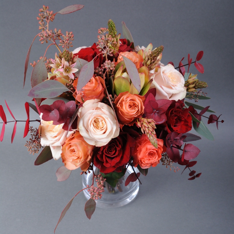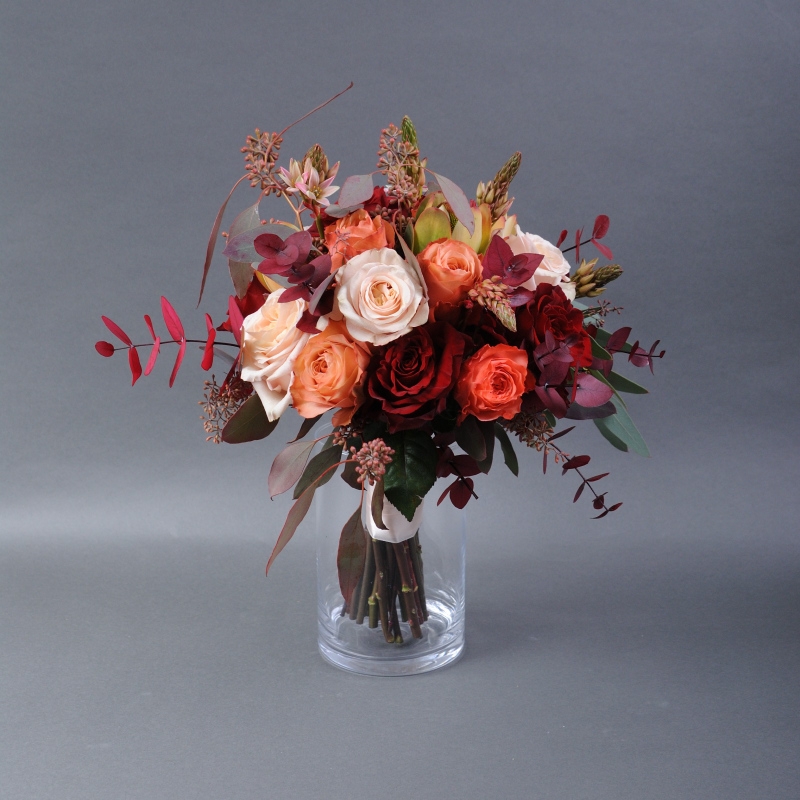 Роза Эксплорер, роза Шимер, роза Кахала, Леукадендрон, Орнитогалум, Эвкалипт Популус с ягодами, Эвкалипт Синерея (окрашенный).