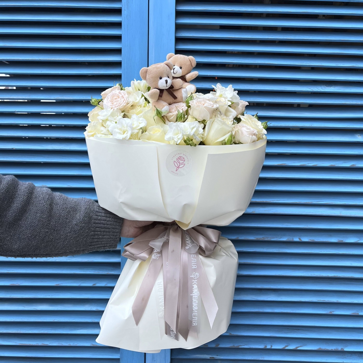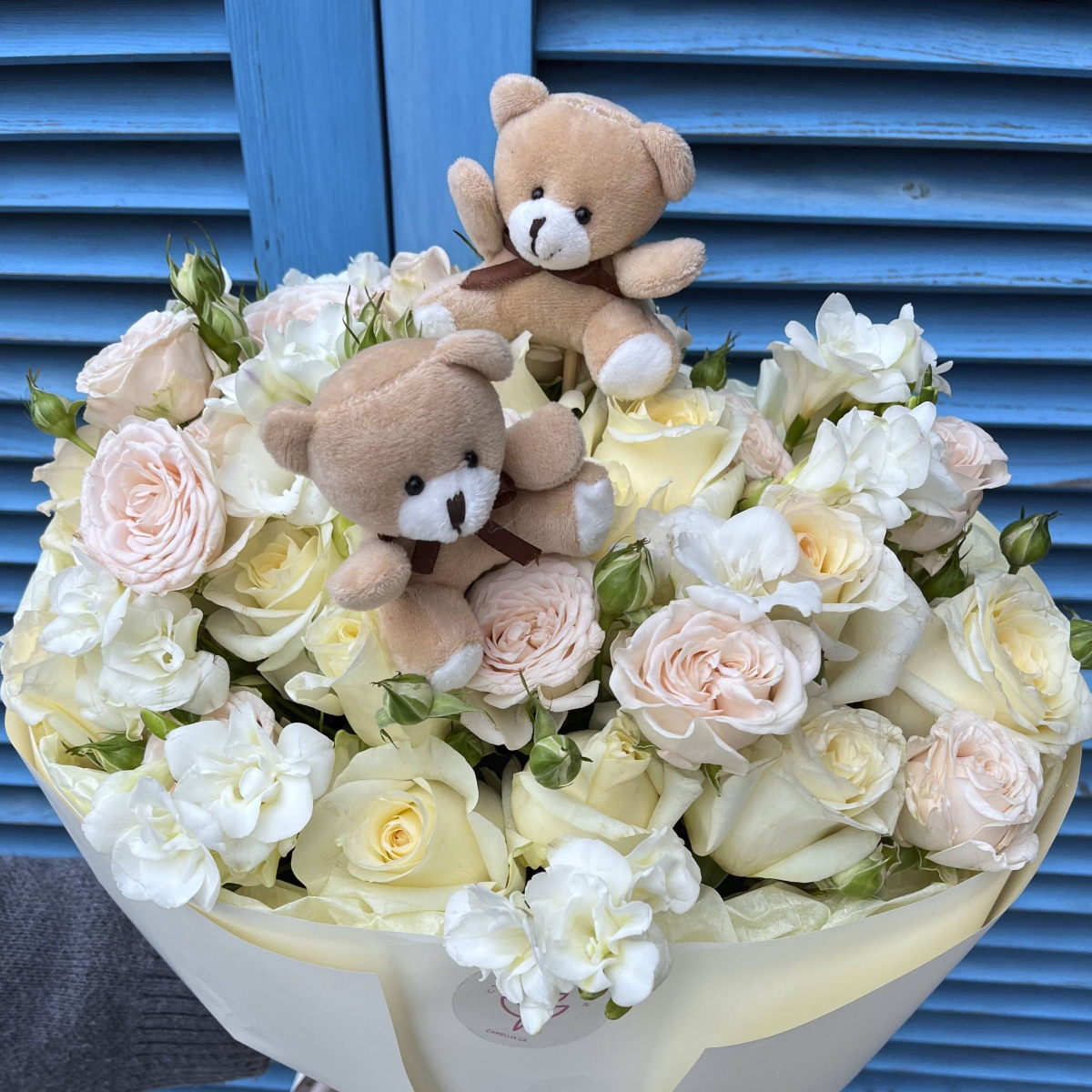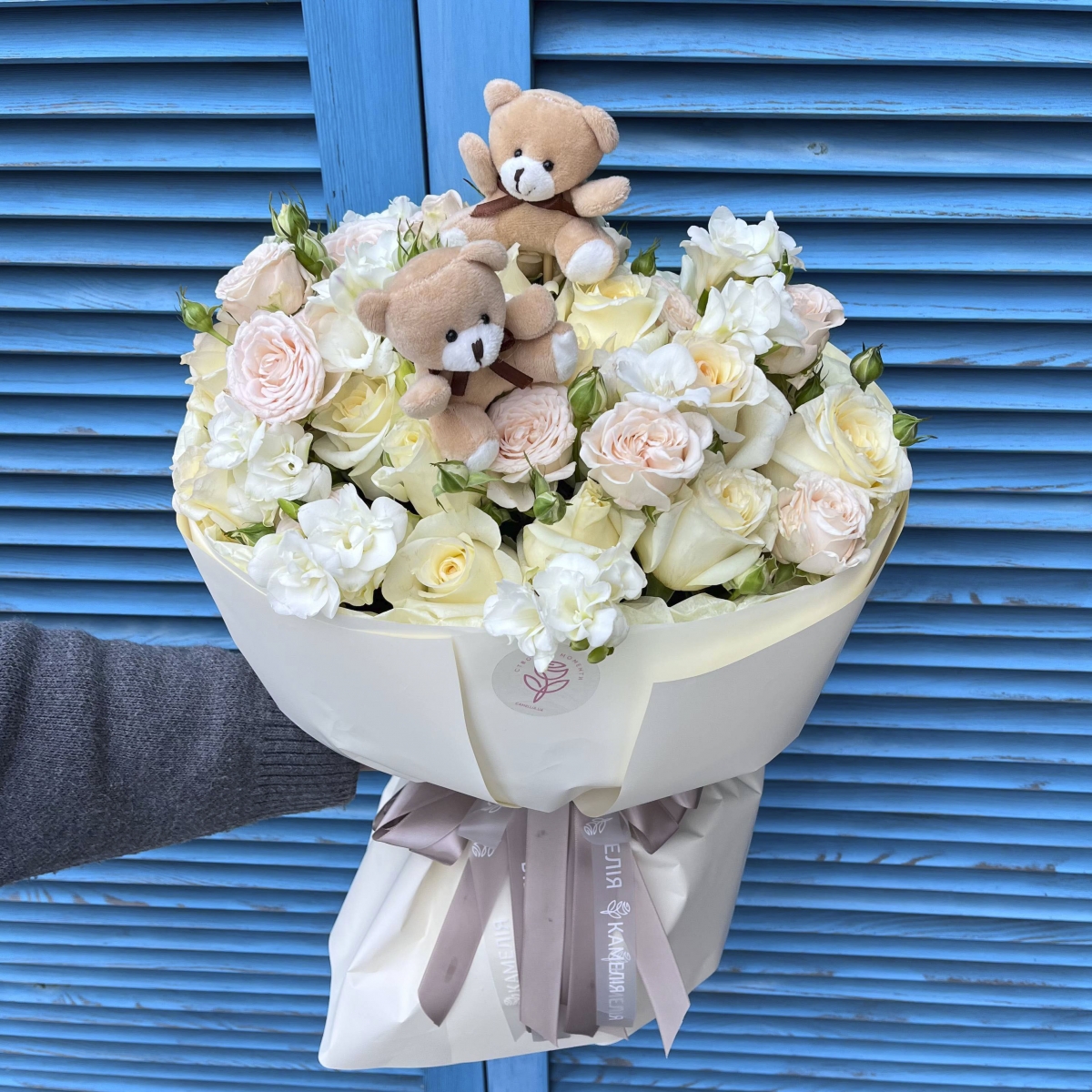Роза Кендлайт кремовая, роза Софи спрей, Фрезия, топпер Мишка мягкий