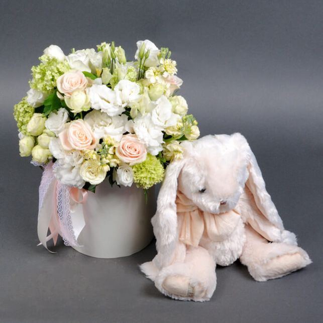 Нежная композиция в шляпной коробке, в состав которой входит: роза Шарман, роза Аваланч, эустома, вибурнум, роза Сноу Ворлд, фрезия, матиола, фисташка, гвоздика и мягкий плюшевый зайчик
