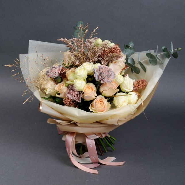 Магазин цветов "Camellia" предлагает вашему вниманию волшебный букет под названием "Капуччино". Эта композиция поражает своей элегантностью и утонченностью. Каждый элемент в этом букете уникален, создавая гармоничный ансамбль цветов и форм.