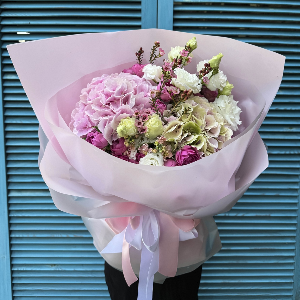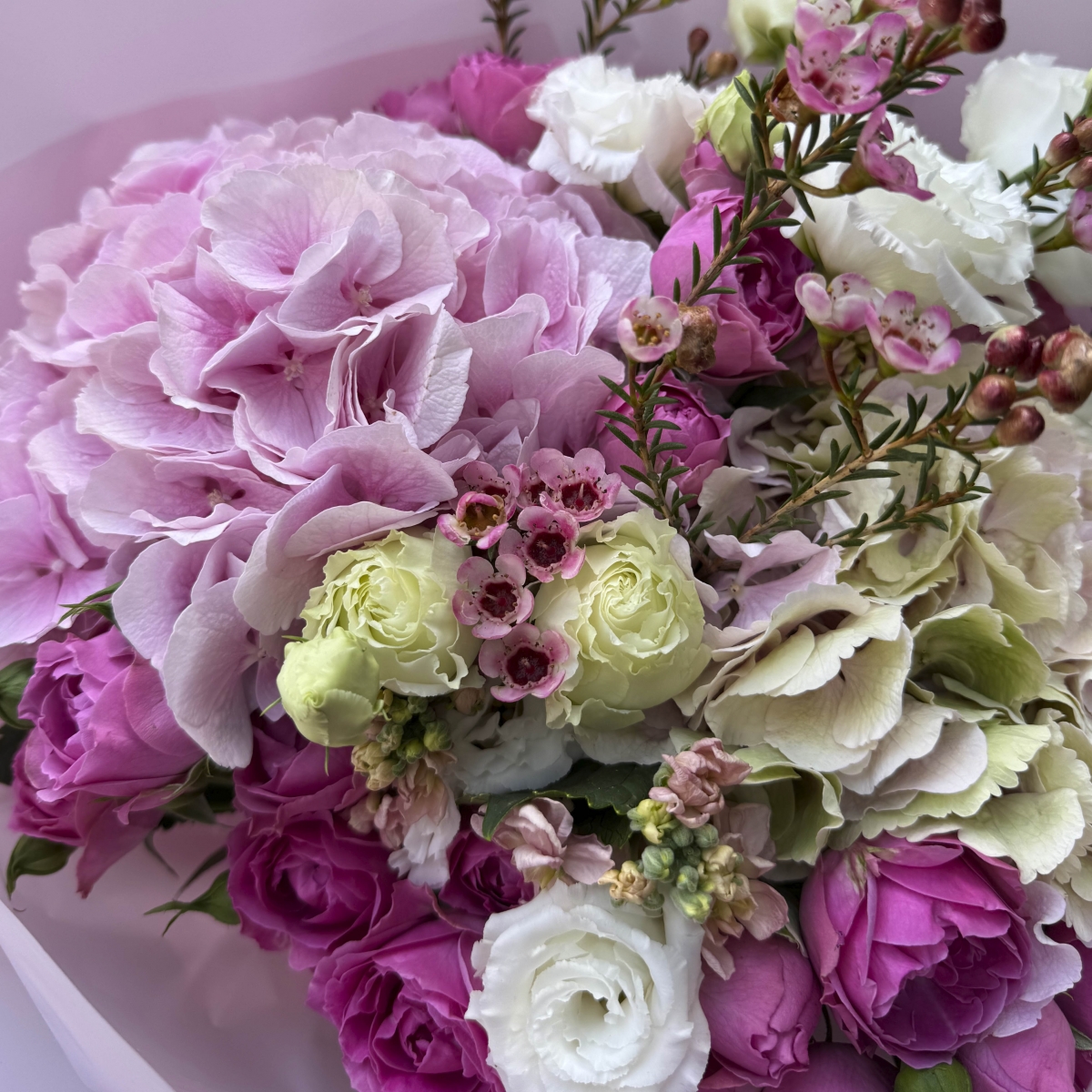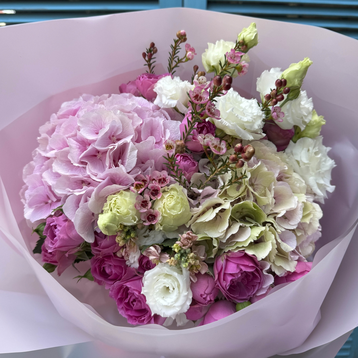Гортензія, Хамелаціум, троянда Місті Баблз спрей, Еустома, Матіола