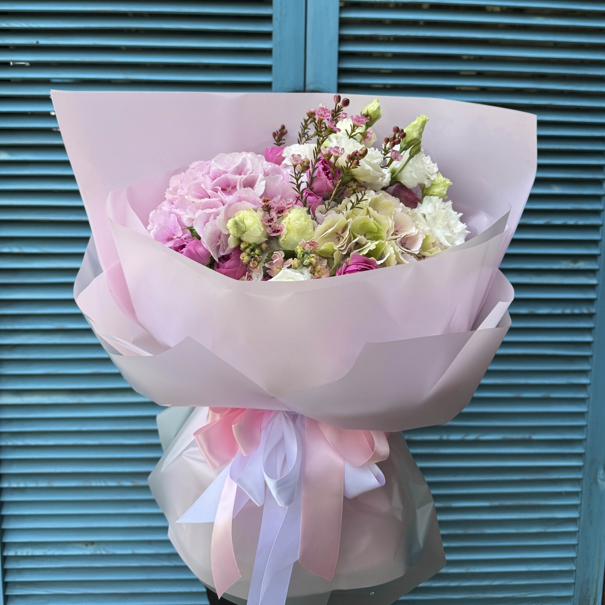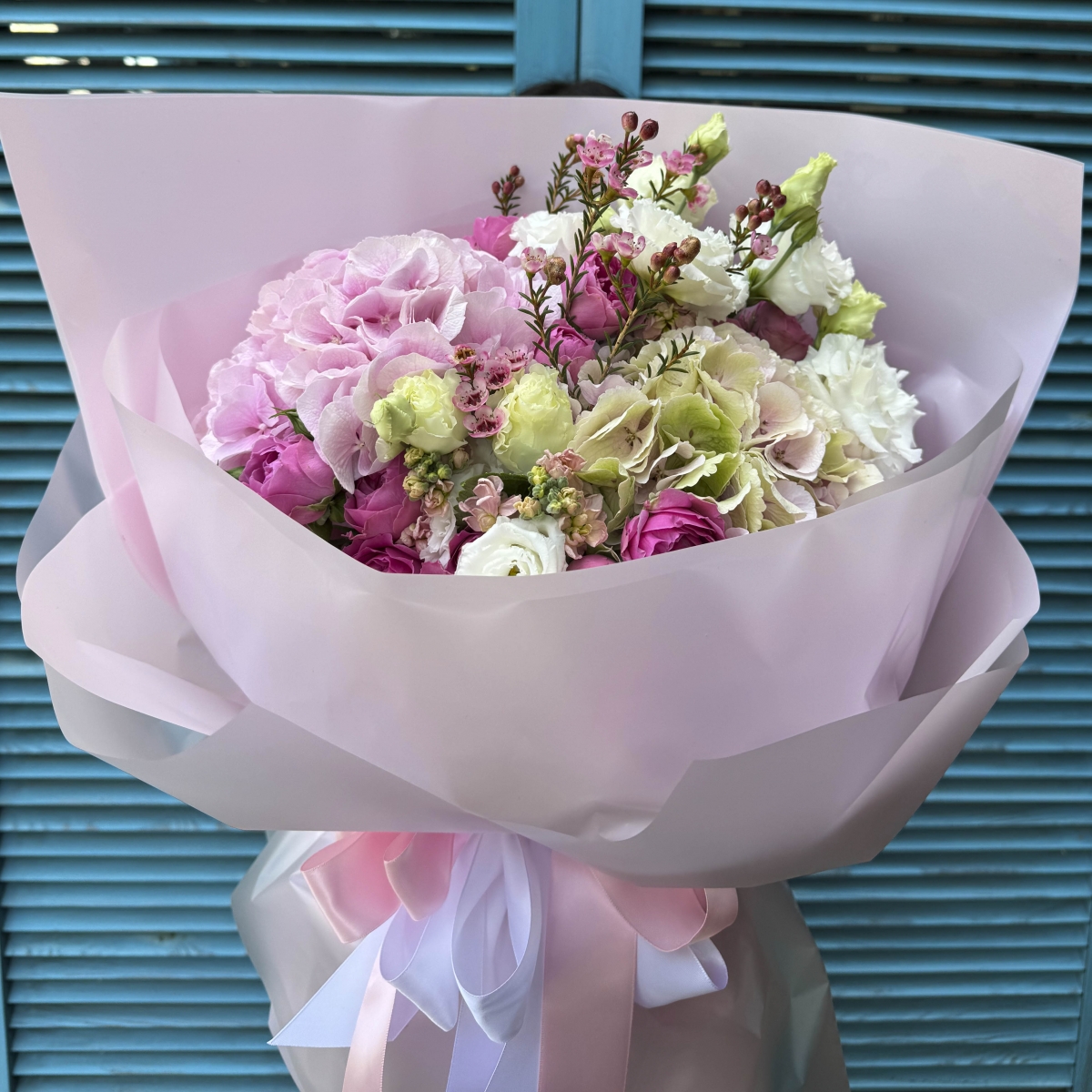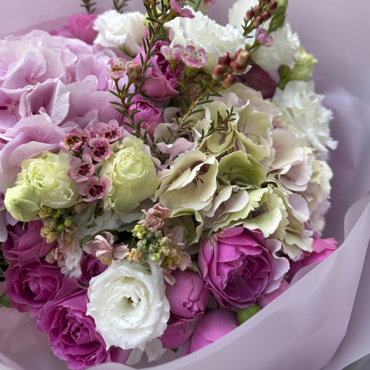 Гортензія, Хамелаціум, троянда Місті Баблз спрей, Еустома, Матіола
