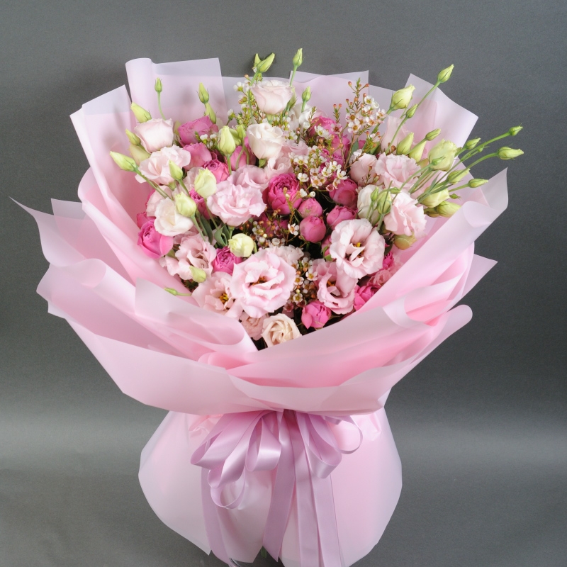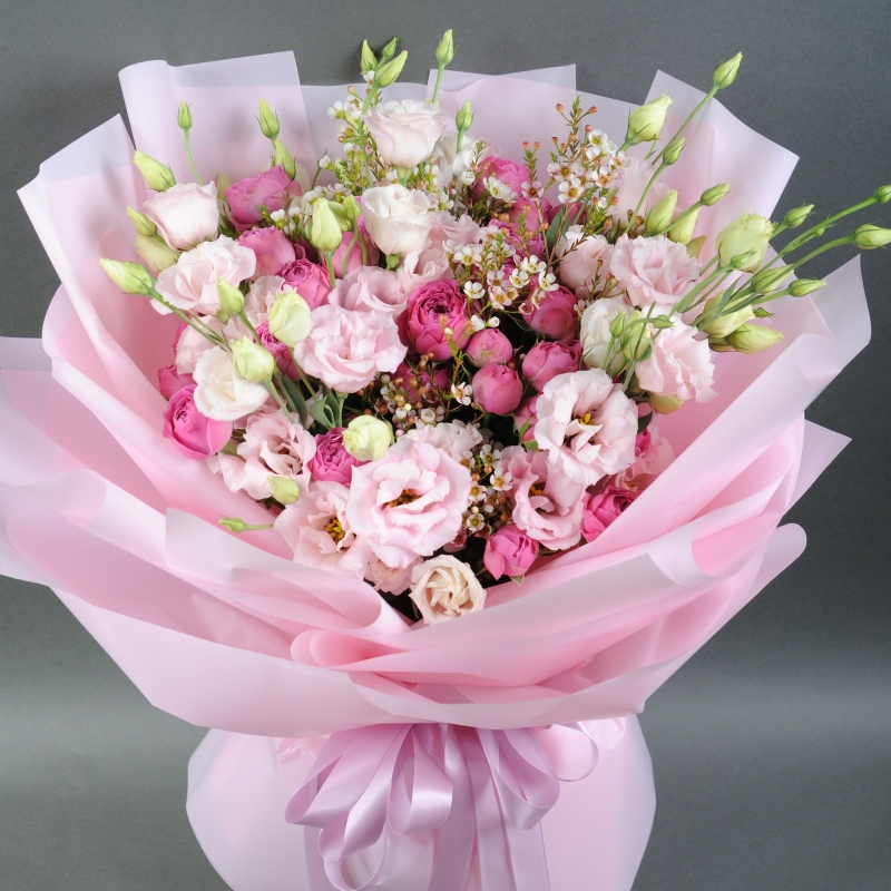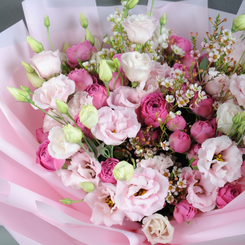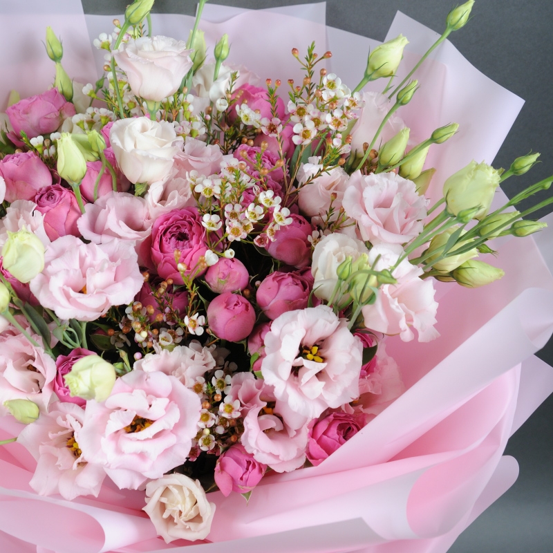 Цей чарівний букет поєднує у собі троянди, що символізують любов, еустому, яка втілює довіру, та хамелаціум, який додає елегантності. Кожна деталь цього букета створює гармонійну і вишукану композицію.
