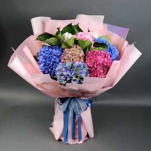Букет складається з 11 гортензій різних кольорів, які створюють неповторний гармонійний образ. Кожна гортензія вміло оформлена в дизайнерську обгортку та прикрашена елегантним атласним бантом, що робить цей букет ідеальним подарунком або доповненням до вашого особливого заходу.