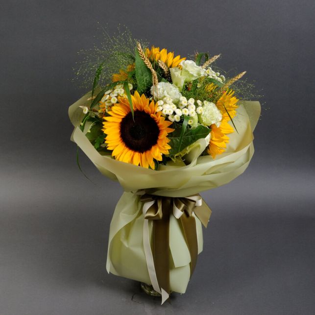 Цей вишуканий букет складається з великої кількості соняшників, панікуму, вібурнуму, танцетуму, еустоми та колоска. Усі ці квіти, відібрані від найкращих постачальників, гармонійно поєднуються, створюючи вражаючий образ природної краси.