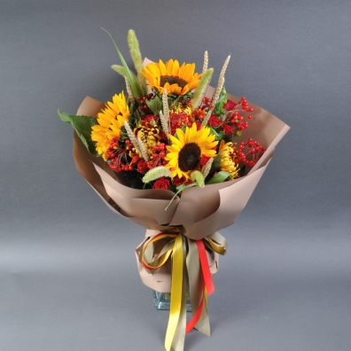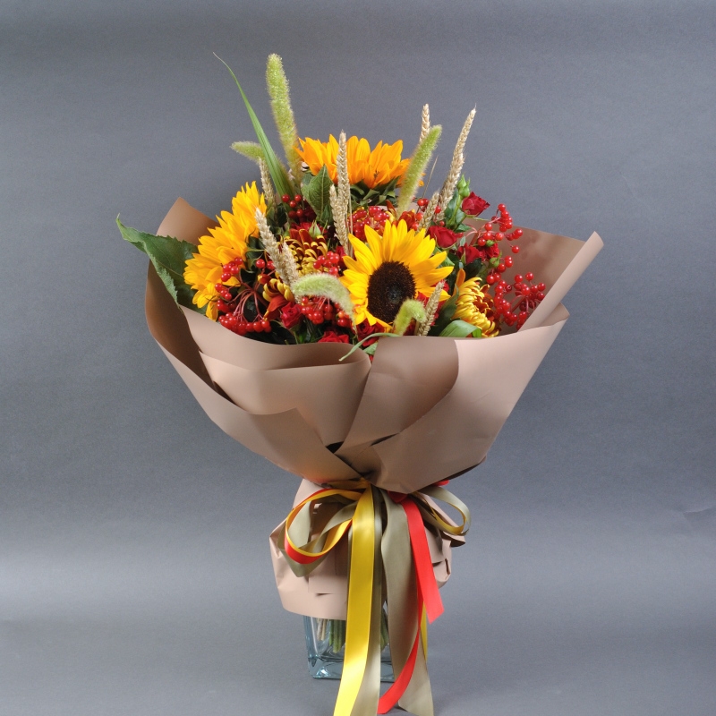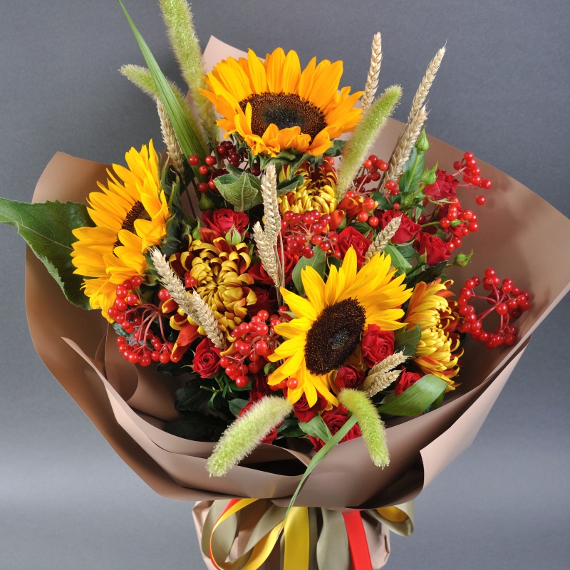 Сонях, Вібурнум, Сетарія, Хризантема, троянда Ред Ванесса спрей, сухоцвіт Трітікум