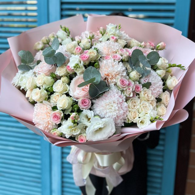 Троянда Софі спрей, імпортна троянда, хризантема, фрезія, еустома, евкаліпт