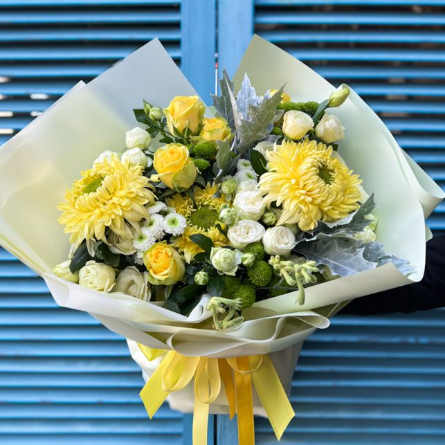 Хризантема, піоноподібна троянда Сноу Ворлд, троянда Пенні Лейн, еустома, куеркус, анігозантос