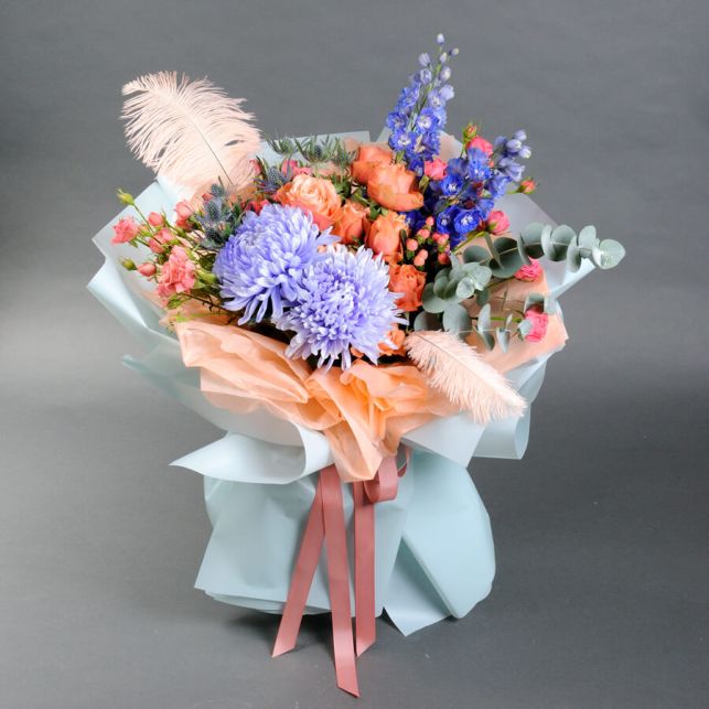 Цей букет - вираження ніжності та витонченості. Завдяки унікальному поєднанню квітів, він створює неповторний ефект "Небесної блакиті". Кожен квітка відібрана з особливою увагою, щоб забезпечити вам тільки найкращу якість.