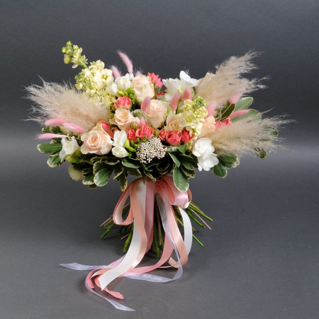 Цей унікальний букет містить квіти імпортного вирощування, серед яких виділяються троянда Шарман, ароматна матіола, троянда спрей Сноу Ворлд, елегантний лагурус, озатамнус, троянда спрей Пінк Ванесса, ніжна фрезія та екзотичний фітоспорум. Кожен елемент у цьому букеті підібраний з особливою увагою до деталей, щоб створити неперевершені враження.