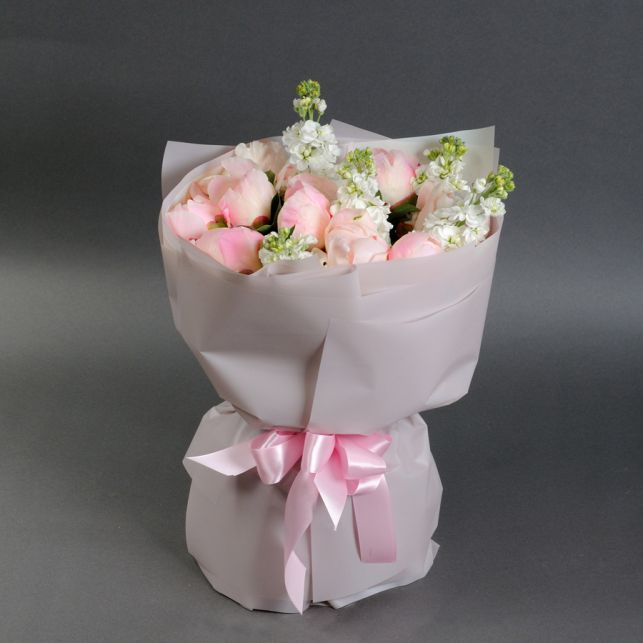 До складу букета входять: півонії та матіола. Букет оформлений у дизайнерський папір.