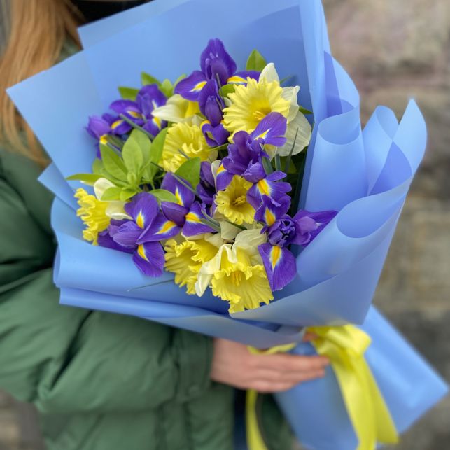 Весняний букет з нарцисами і ірисами