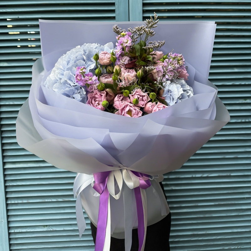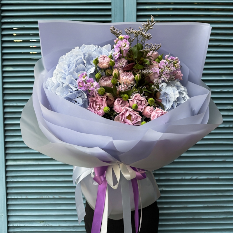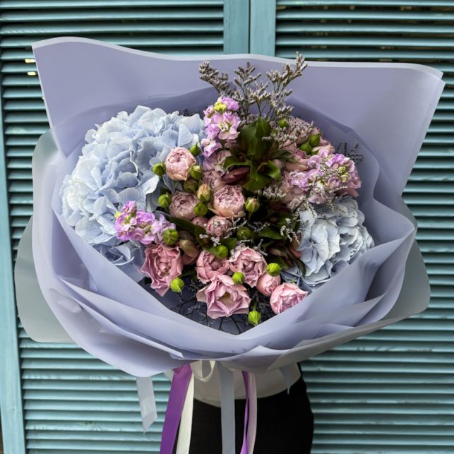 Гортензія, піоноподібна троянда Лавандер Бабблз, лимоніум, хелеборус, матіола