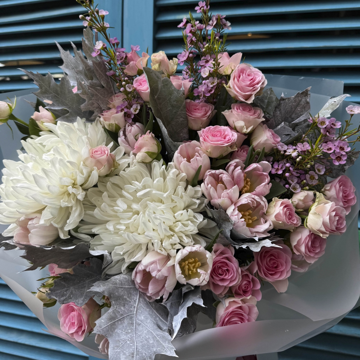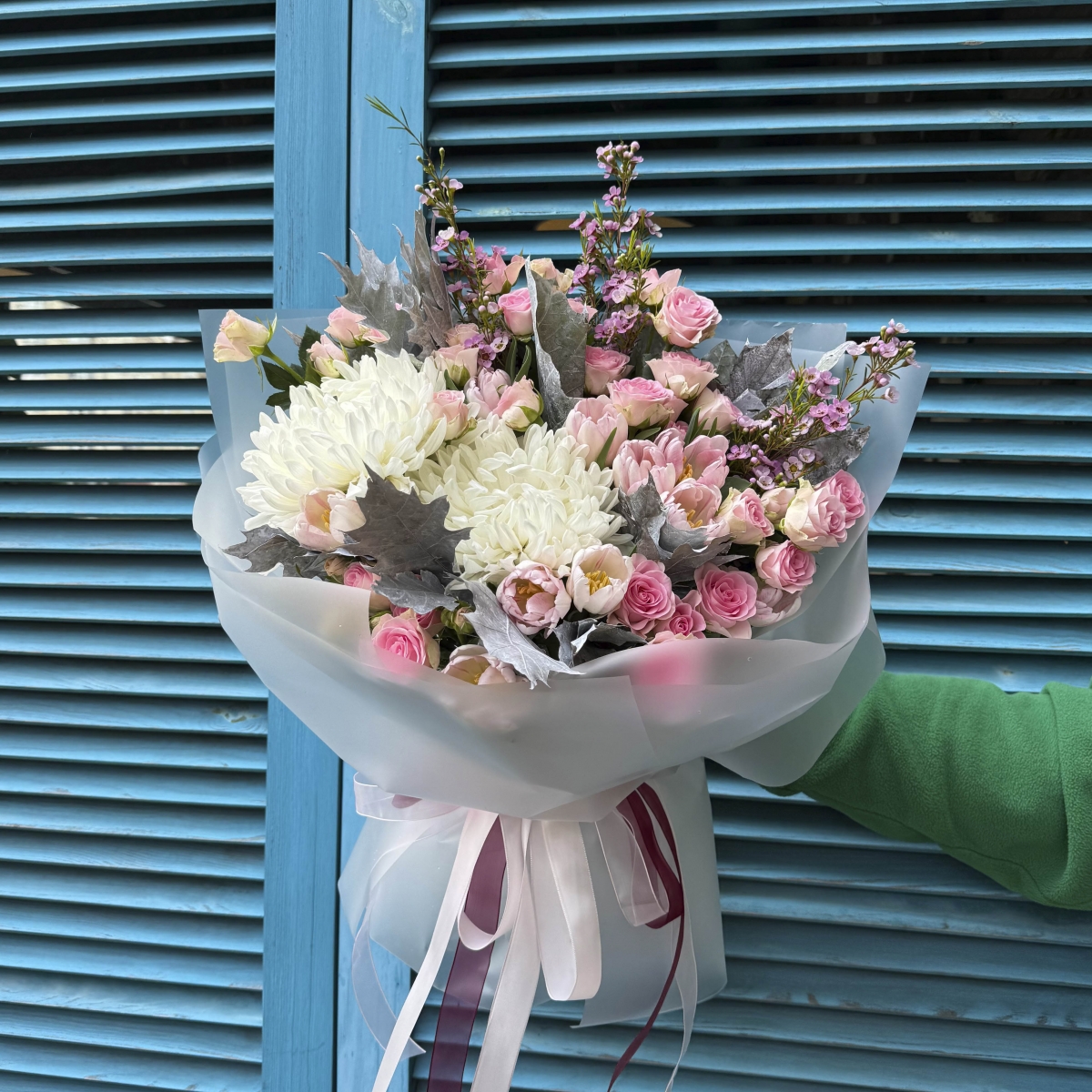 Троянда Гуд Муд, хризантема, тюльпан, хамелаціум, куеркус