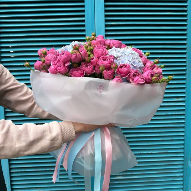 Букет з гортензією і трояндою "Місті Бабблз" від магазину Camellia — це витончена композиція, що надихає своєю красою. Кожна деталь цього букету виражає відчуття тепла і ніжності. Гортензія, яка символізує вдячність та любов, в поєднанні з трояндою, яка вважається символом пристрасті, створюють чарівний ансамбль.