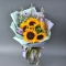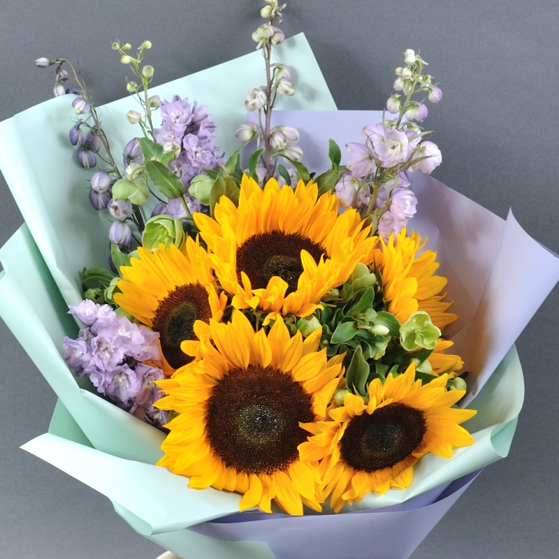 Серце букету - соняшники, які символізують радість та позитивні емоції. Вони додають сонячного настрою та тепла. Дельфініум, в свою чергу, дарує елегантність та легкість, перетворюючи букет у витончений ансамбль.