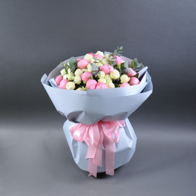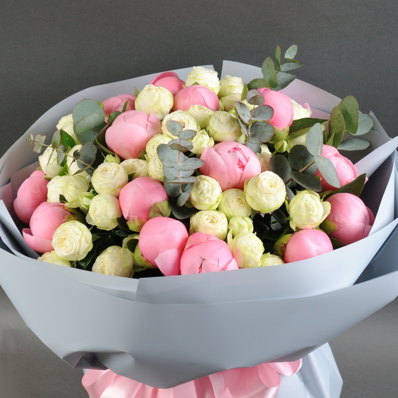 Півонія, троянда Сноу Волд спрей, Евкаліпт Синерея.