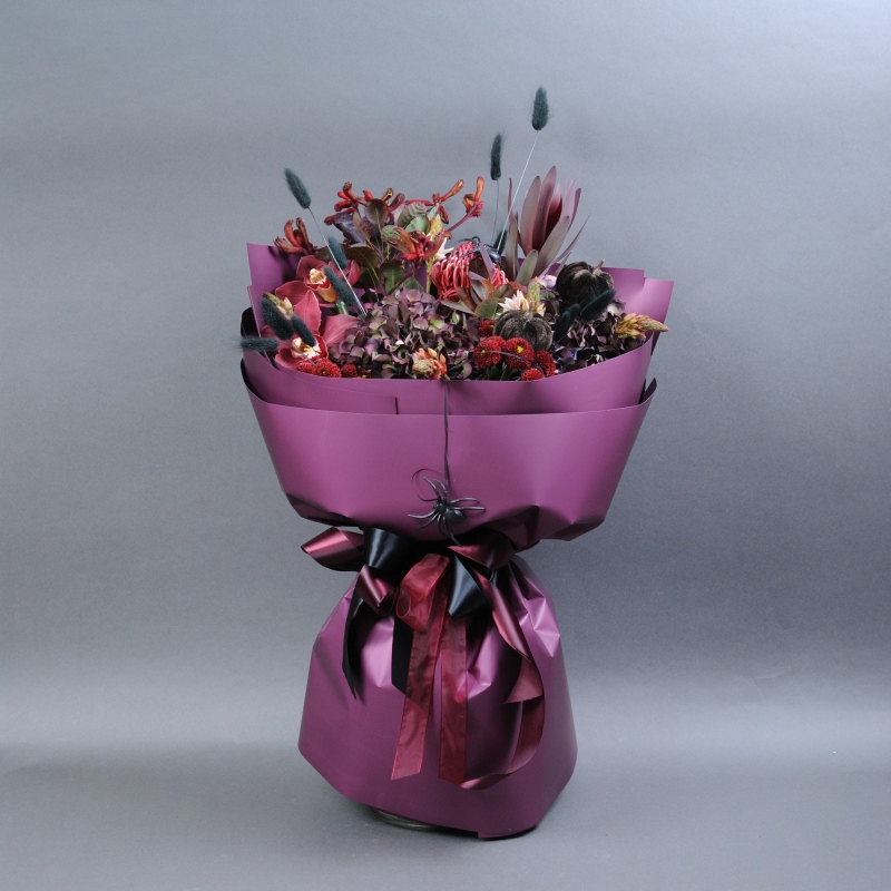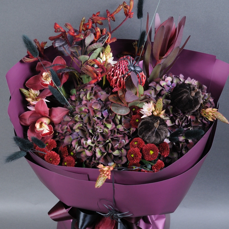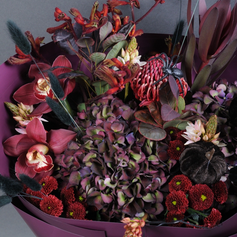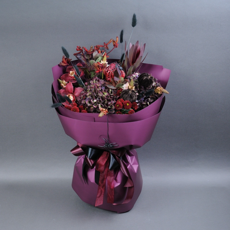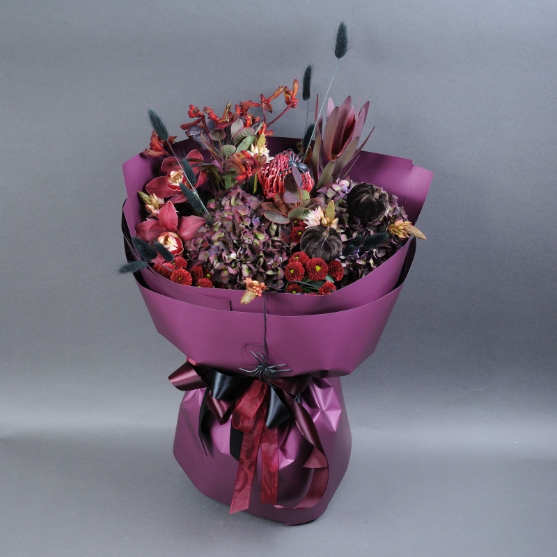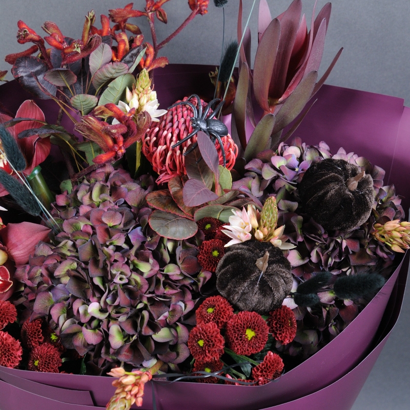 Гортензія, Леукадендрон, Орнітогалум, Протея, Котінус, Анігозантос, Орхідея цимбідіум, Хризантема Сантіні, Сухоцвіт Лагурус фарбований, Топпер Гарбуз.