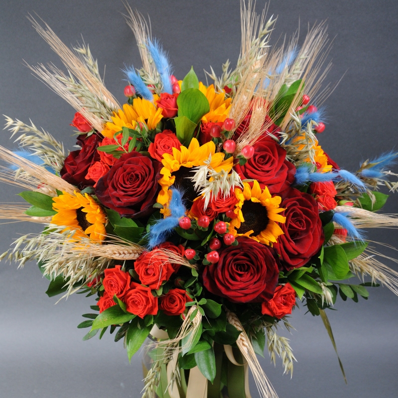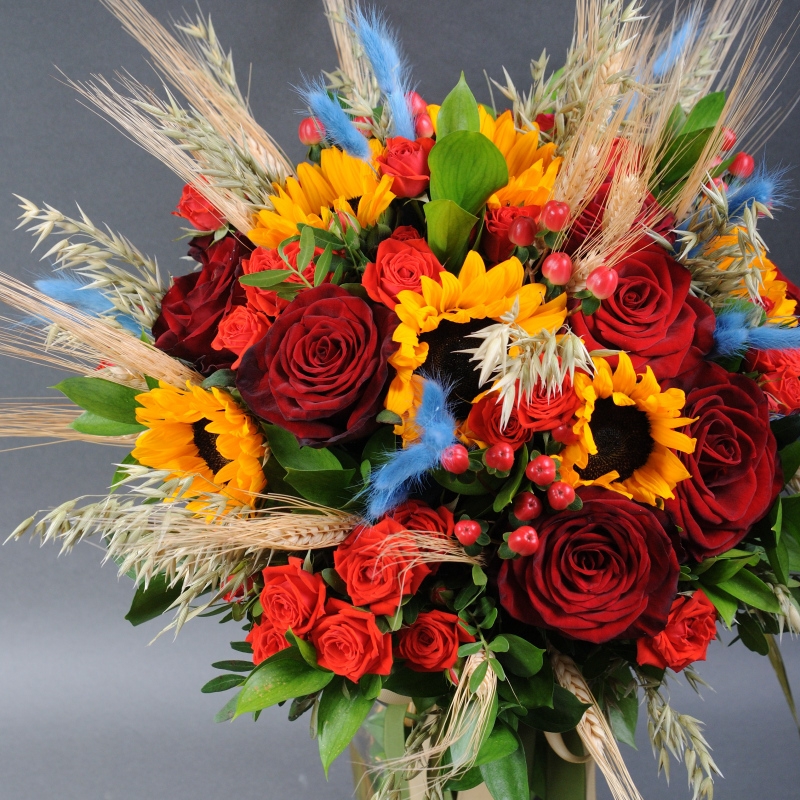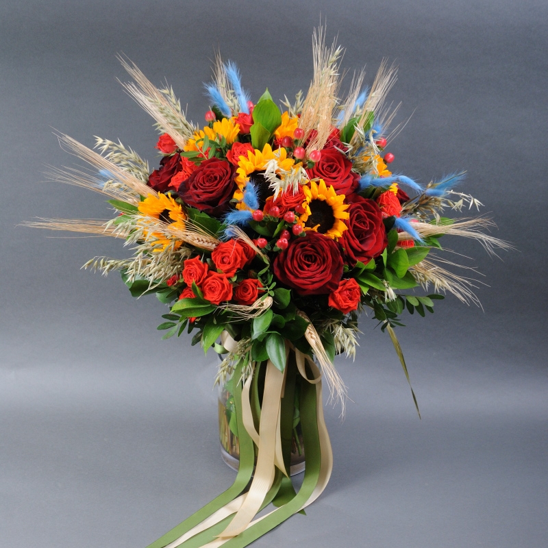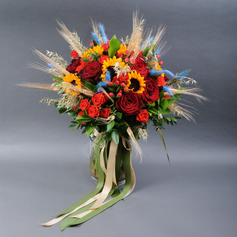 Сонях(Хеліантус), Рускус, Хіперікум, Фісташка, Ванесса спрей, троянда Гран Прі, сухоцвіт Овес , сухоцвіт Жито , сухоцвіт Лагурус фарбований.