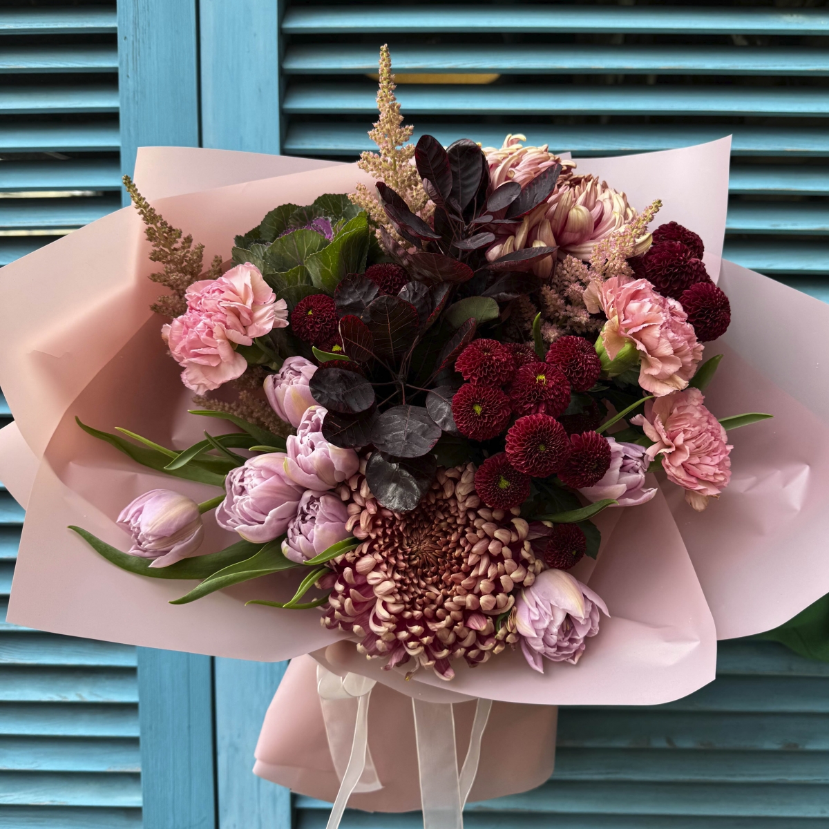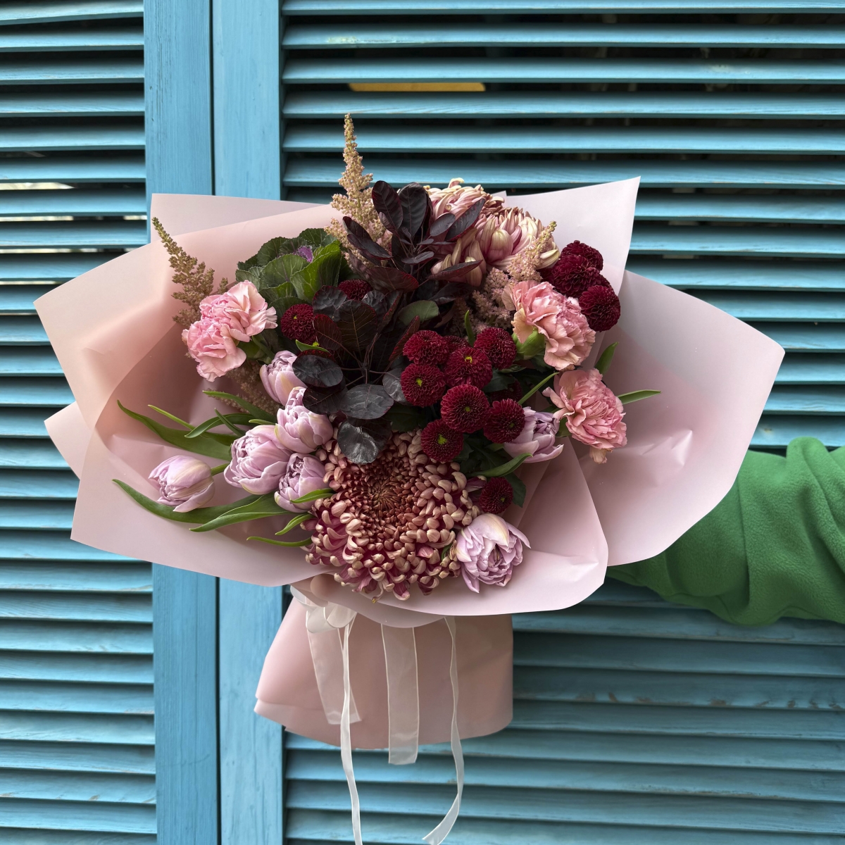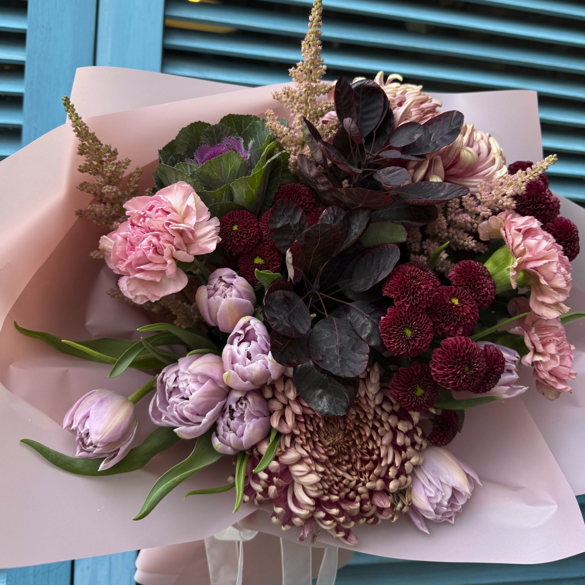 Хризантема, котінус, астільба, брассіка,тюльпан, гвоздика